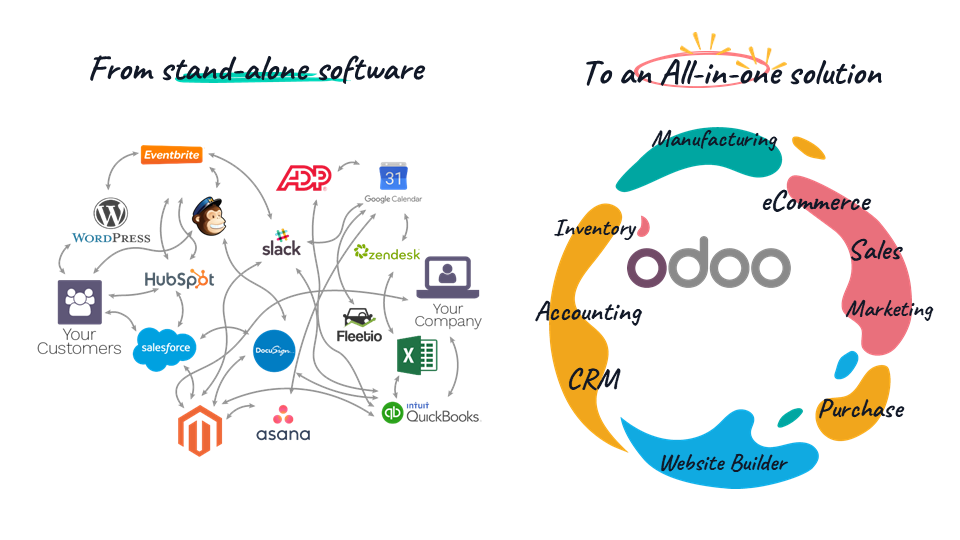 Odoo est un logiciel de gestion tout-en-un qui centralise vos ventes, votre comptabilité, vos stocks, vos projets et votre e-commerce dans une seule plateforme, avec des données connectées et mises à jour en temps réel.
